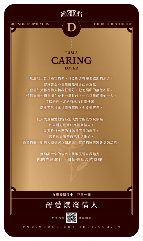 無法阻止自己感性的你,只要對方有需要協助的地方,你就會忍不住想挽起袖子出手幫忙,裡裡外外都為情人精心打理好,把他照顧的無微不至,任何事情也願意攔在身上一肩扛起,一心只想呵護他一人,這樣的你十足的有能力有責任感,處事非常可靠也值得信賴,但要提醒你,投入大量關愛很容易造成對方的依賴現象喔,如果對方逐漸成為媽寶情人,就要檢視自己的行為是不是過度了,適時的去調整自己生活重心,適當的去平衡情人關係與互相溝通,你們的感情將會更融洽唷。