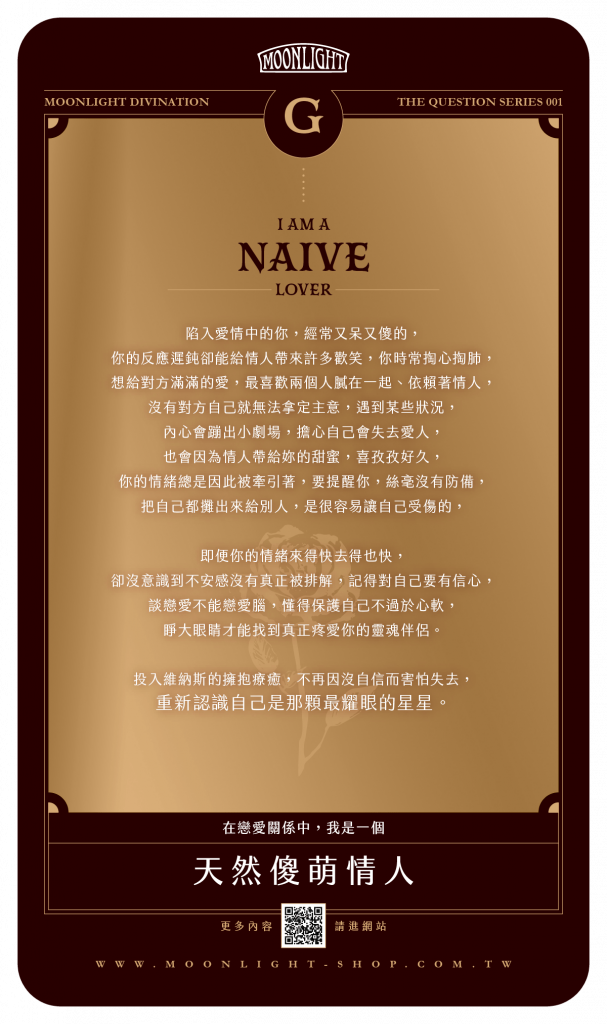 陷入愛情中的你,經常又呆又傻的,你的反應遲鈍卻能給情人帶來許多歡笑,你時常掏心掏肺,想給對方滿滿的愛,最喜歡兩個人膩在一起、依賴著情人,沒有對方自己就無法拿定主意,遇到某些狀況,內心會蹦出小劇場,擔心自己會失去愛人,也會因為情人帶給妳的甜蜜,喜孜孜好久,你的情緒總是因此被牽引著,要提醒你,絲毫沒有防備,把自己都攤出來給別人,是很容易讓自己受傷的, 即便你的情緒來得快去得也快,卻沒意識到不安感沒有真正被排解,記得對自己要有信心,談戀愛不能戀愛腦,懂得保護自己不過於心軟,睜大眼睛才能找到真正疼愛你的靈魂伴侶。